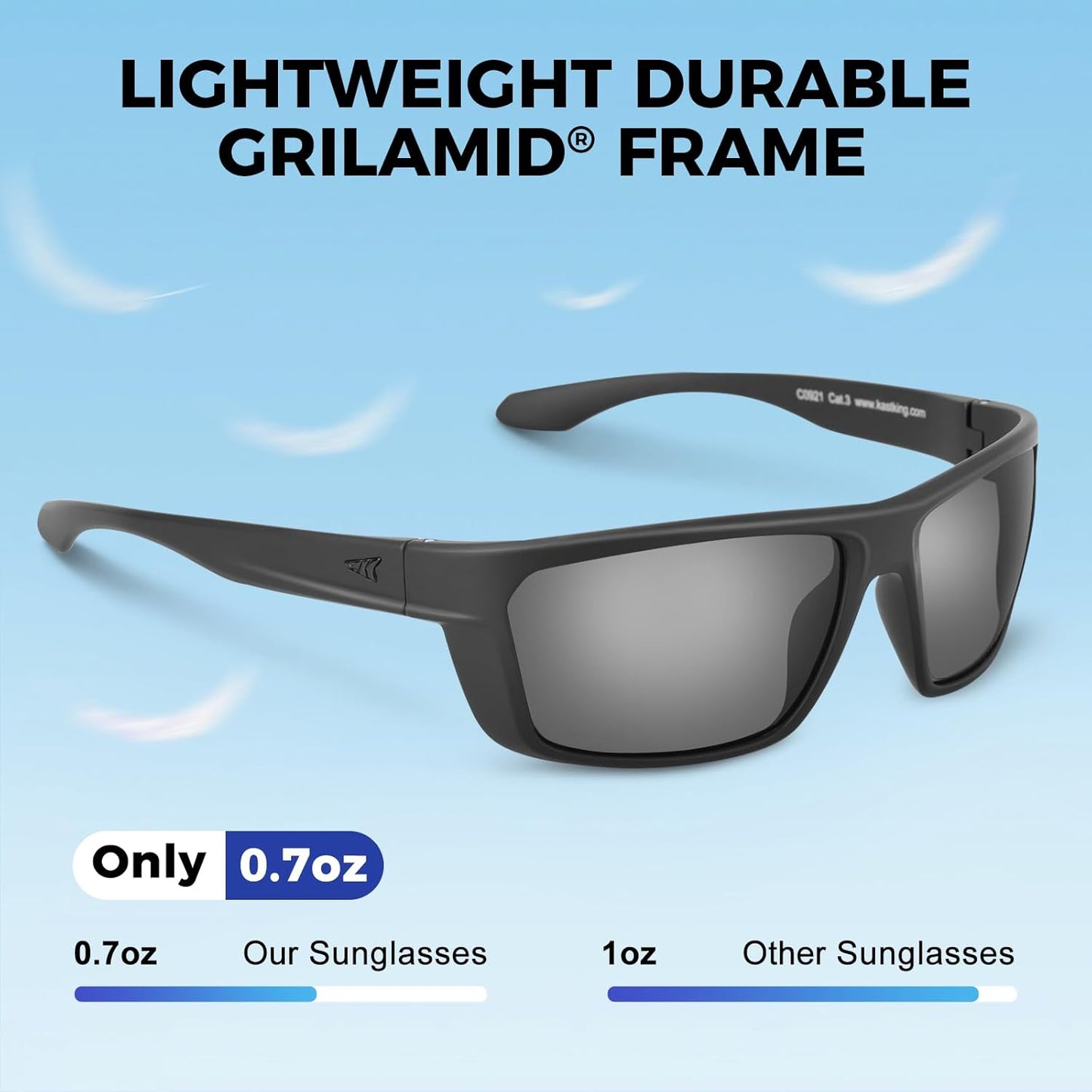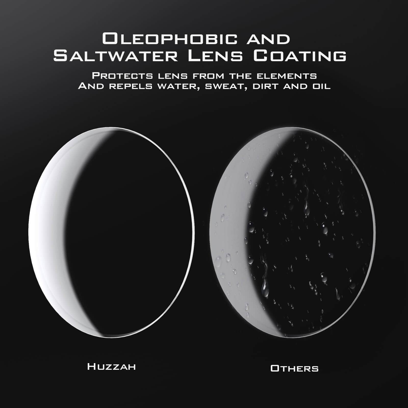 - KEY FEATURES – Oleophobic lens coating repels saltwater, oil, and chemicals - Polarized lenses reduce glare - Impact resistant TAC lenses protect your eyes from flying objects - Block 100% of the harmful UVA and UVB rays - Lightweight, durable, and comfortable Grilamid frames – 30 Day Money Back Guarantee
